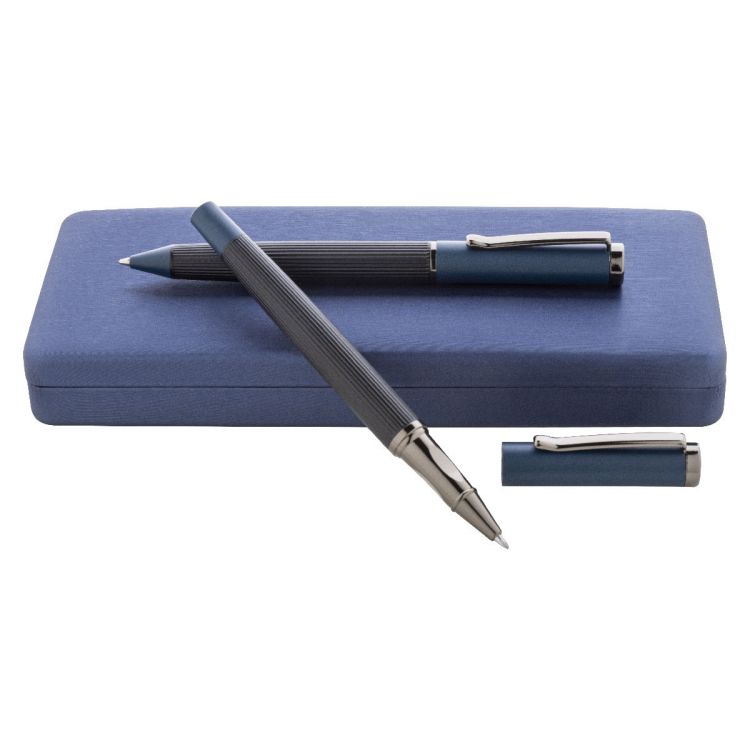 Elegantes Kugelschreiber- und Tintenroller-Set aus Metall mit gestreiftem Schaft, farbigen Akzenten und glänzenden Gunmetal-Details, blauschreibend. In farblich abgestimmter Geschenkbox. Marke: André Philippe.