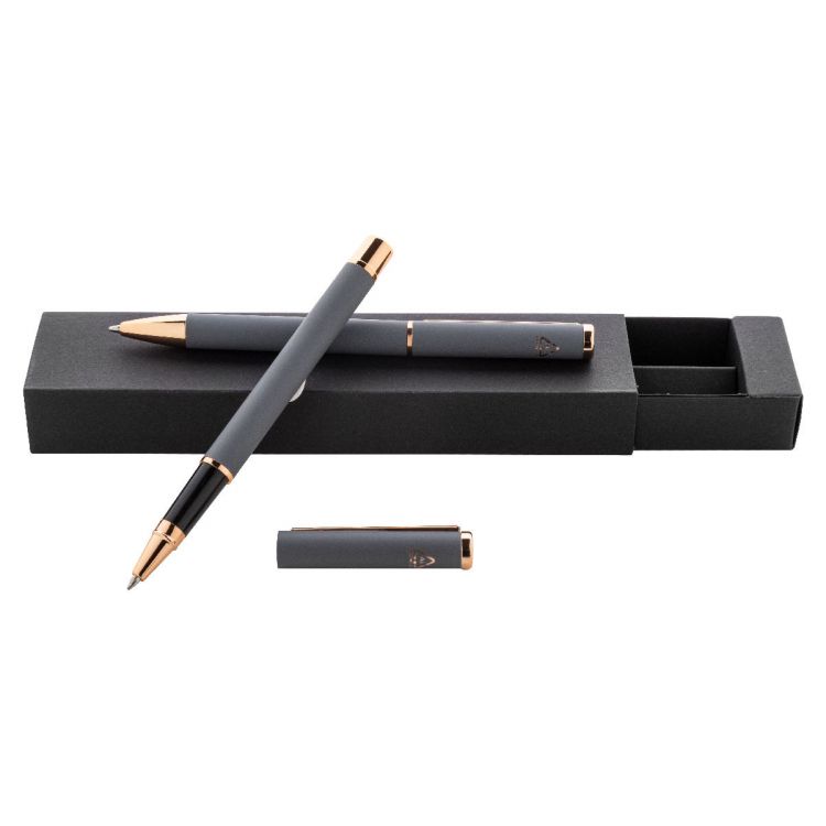 Kugelschreiber- und Tintenrollerset aus recyceltem Aluminium mit gummierter Oberfläche und roségoldenen Details, blauschreibend. Mit Spezialbeschichtung für Spiegelgravur in Roségold. Einzeln in schwarzer Geschenkbox aus Papier.