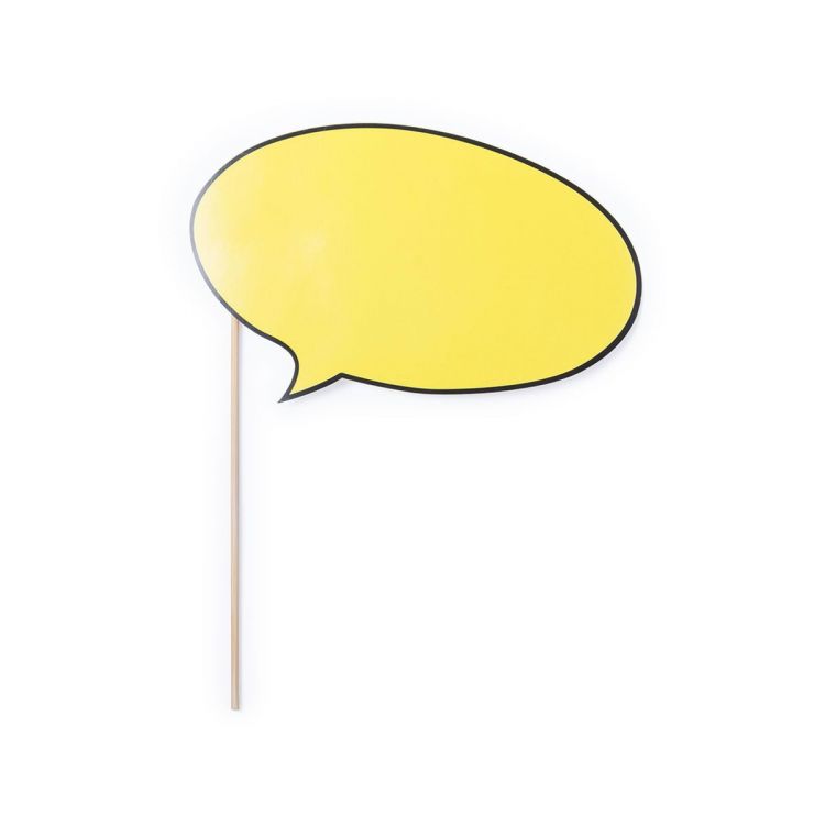 Selfie-Sprechblase in auffälligem Gelb mit großer Druckfläche. Hergestellt aus Pappe mit Holzgriff. (natürlich farbe)