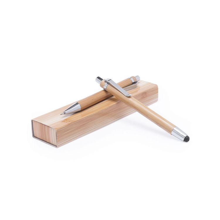 Set aus Druck-Kugelschreiber und Druck-Bleistift mit Schaft aus natürlichem Bambusholz und Kontrastdetails in glänzendem Silber-Metallic. Präsentiert in einer glänzenden Karton-Schachtel im Holz-Look. Kugelschreiber mit Jumbo-Patrone mit blauer Tinte und Bleistift mit 0,7 mm Minen. (natürlich farbe)
