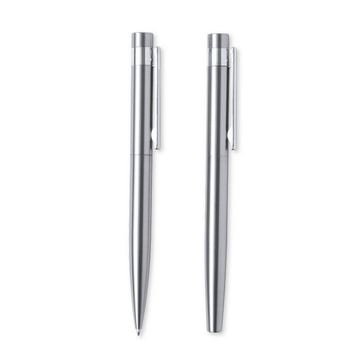 Umweltfreundliches Kugelschreiber- und Rollerball-Set, hergestellt aus recyceltem Edelstahl. Enthält:Kugelschreiber mit Drehmechanismus, versilbertem Gehäuse und verchromten Beschlägen. Metallclip und Logo für recycelten Edelstahl auf der Oberseite des Stiftes. Jumbo-Patrone und blauschreibende Tinte.Rollerball mit silberfarbenem Gehäuse und verchromten Beschlägen. Metallischer Clip und Logo für recycelten Edelstahl auf der Oberseite der Kappe. Jumbo-Patrone und blauschreibende Tinte.Das Set wird in einem individuellen Kraftkarton mit passender Hülle präsentiert.Stahl ist einer der begehrtesten Werkstoffe und fast überall zu finden, von Alltagsprodukten bis hin zu großen Bauwerken. Es verfügt über zahlreiche Eigenschaften, darunter Langlebigkeit und ein hohes Maß an Wiederverwendbarkeit, was es zu einer hochgeschätzten Alternative für nachhaltige Lösungen macht. Richtig behandelt, lassen sich daraus neue Ressourcen von unendlichem Nutzen gewinnen. (silber farbe)