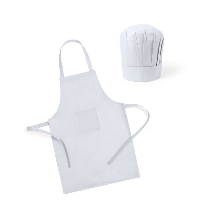 Non-Woven-Kinderschürze und Kochmütze aus Faservlies in kräftigen Farben. Schürze mit Fronttasche und Bändern zum Einstellen.