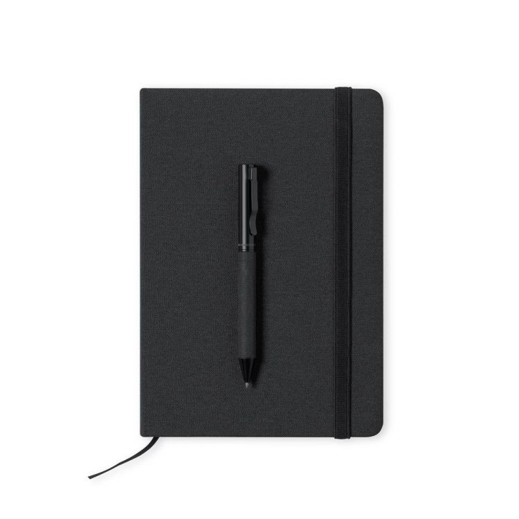 Set aus Notizblock und Stift von Antonio Miró. Enthält:Notizblock in elegantem Schwarz, aus strapazierfähigem 300D-Polyester, mit festem Umschlag und passendem Gummizug. Innenseite mit 100 linierten Blättern.Kugelschreiber aus Metall mit Drehmechanik und blauschreibender Tinte. Mit schwarzem Schaft und Zierleiste, Metallclip und Markenlogo.Das Set wird in einer eleganten und stabilen schwarzen Einzelschachtel mit Antonio Miró-Logo und passender Schutzhülle präsentiert. (schwarz farbe)