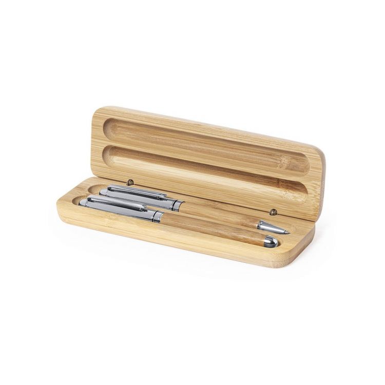 Linie "Natur" Kugelschreiber- und Rollerpenset. Hergestellt aus einer Kombination von Bambus und Metall, um die Verwendung von natürlichen Rohstoffen zu fördern und Schadstoffemissionen zu reduzieren. Kugelschreiber mit Drehmechanik und blauer Tinte. Rollerpen mit Kappe, Gel-Tinte in Blau und Jumbo-Mine. Präsentiert in einem individuellen Bambusetui. (natürlich farbe)