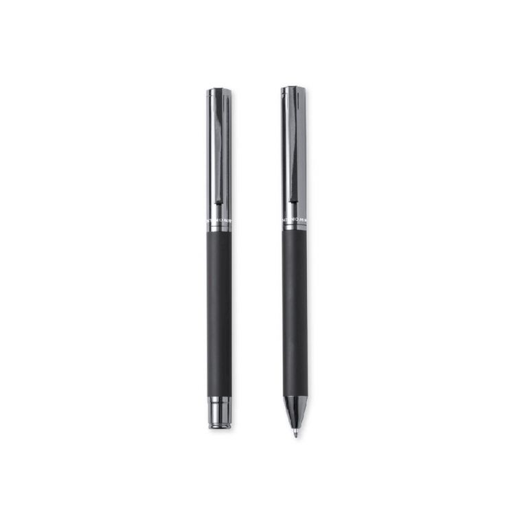 Antonio Miró Kugelschreiber- und Rollerball-Set. Enthält:Kugelschreiber aus Metall mit mattschwarzem Schaft. Verchromte Beschläge und Kappe mit Markenlogo Jumbo-Patrone und blauschreibender Tinte.Metallischer Tintenroller mit mattschwarzem Schaft. Verchromte Beschläge und Kappe mit Markenlogo. Jumbo-Patrone und blauschreibender Tinte.Präsentiert in einem eleganten und widerstandsfähigen schwarzen Einzeletui mit Antonio-Miro-Logo, Magnetverschluss und passender Schutzhülle. (schwarz farbe)