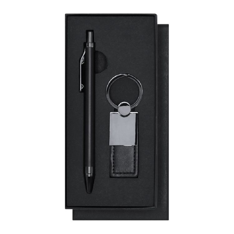 Elegantes Premium-Set, das enthält: recycelten Aluminiumstift mit mattschwarzer Oberfläche, Druckknopfmechanismus und blauer Tinte. Mit Clip und ABS polierter Spitze. Enthält Badge aus recyceltem Aluminium.Eleganter Schlüsselanhänger mit Band aus PU, Polyester und Chromaccessoires. (schwarz farbe)
