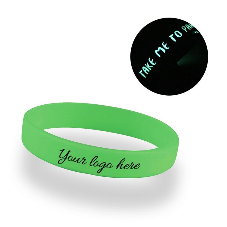 Kundenspezifische Silikonarmbänder mit im Dunkeln leuchtendem Logo. Das Armband kann mit einem eingravierten Logo in flachem Relief ohne Farbe oder mit einem farbigen Logo in nur einer Farbe personalisiert werden.