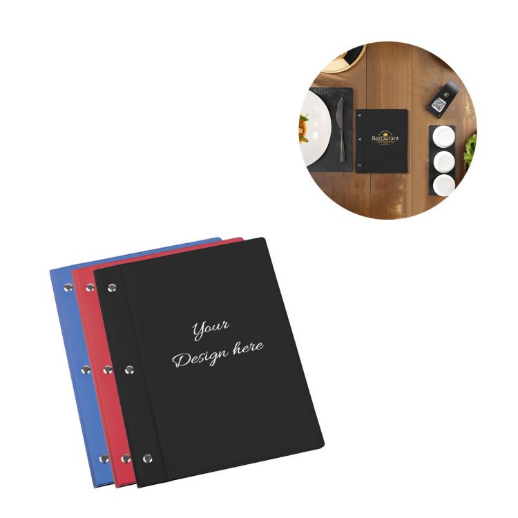 Speisekarte aus PVC (außen) und Kunstleder (innen). Auf der Leiste gibt es 3 Lochungen für die Buchschrauben, die demontiert geliefert sind. Der Artikel besitzt auch 10 Schutzhüllen aus PPL mit universaler 11-fach Lochung. Sie werden demontiert geliefert
