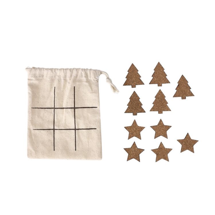 Tic-tac-toe-Spiel aus Naturkork. Inklusive 5 baumförmigen Spielsteinen und 5 sternförmigen Spielsteinen. Präsentiert in einem Baumwollbeutel mit Kordelzug, der als Spielbrett verwendet wird.Hergestellt aus pflanzlichen Elementen zur Förderung der Nutzung natürlicher Rohstoffe und zur Reduzierung der Schadstoffemissionen. (natürlich farbe)