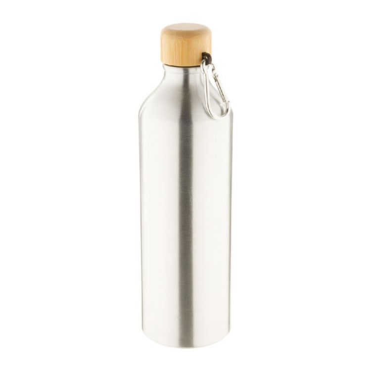 Sportflasche aus Aluminium mit Bambusdeckel und Karabiner. Füllmenge: 800 ml.