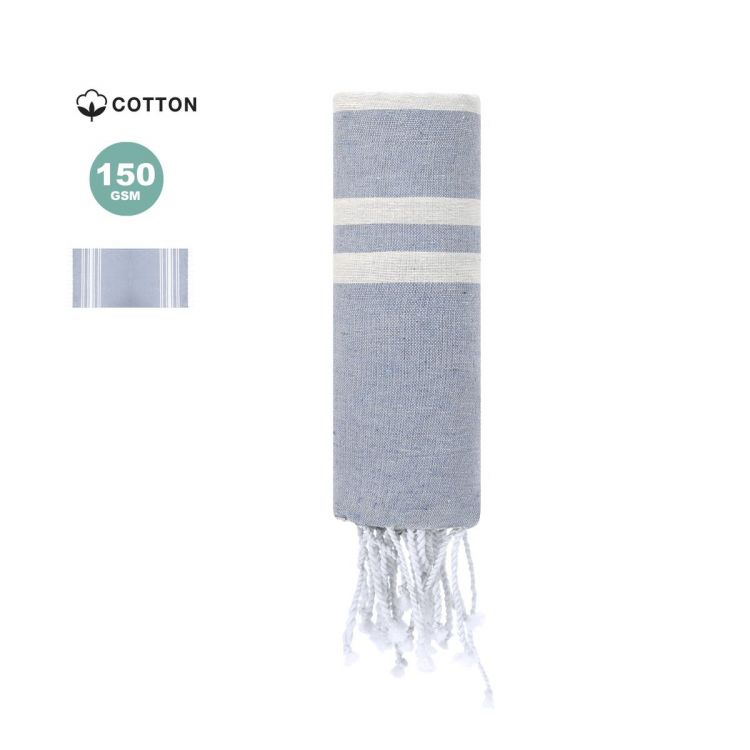 Weicher Pareo-Handtuch von 150 g/m2 in einer Kombination aus Baumwolle und Polyester. Sein Design hat einen bunten Hintergrund mit weißen Streifen. Enthält Fransen an den Enden, die ein dekoratives Detail hinzufügen und den Abschluss vervollständigen.