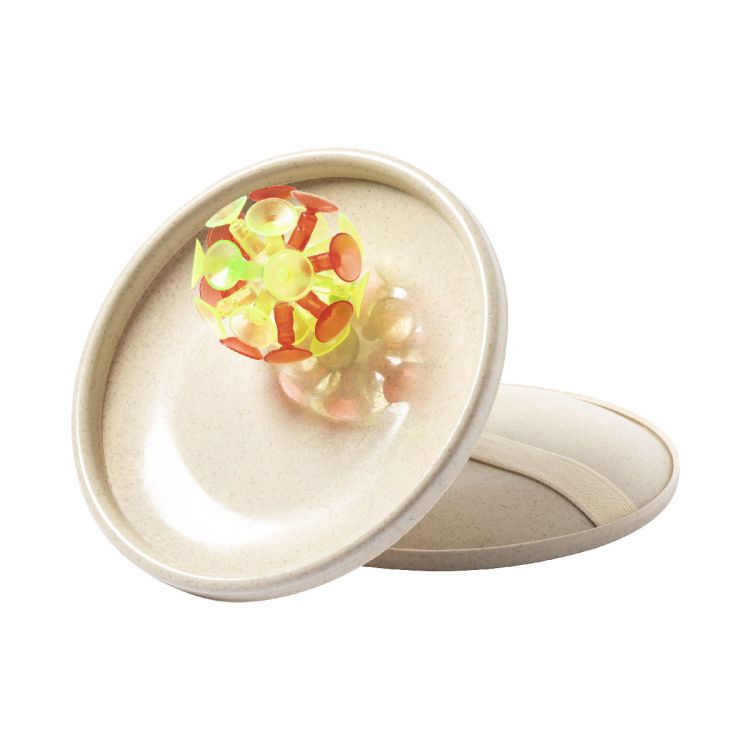 Strandspiel, bestehend aus Bällen mit Saugnäpfen und flachen Paddelscheiben aus Weizenstroh mit elastischem Band, in natürlich farbe