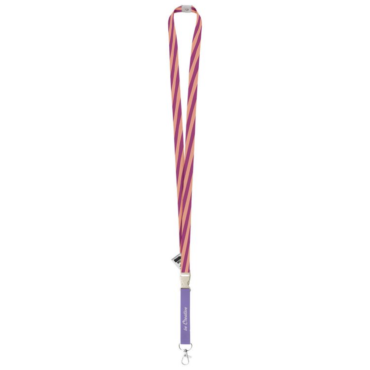 Individuelles Lanyard aus RPET, 15 mm breit, mit abnehmbaren Metallkarabiner und Panikverschluss aus Weizenstrohkunststoff. Der Preis ist inkl. Sublimationsdruck auf beiden Seiten. Mindestmenge: 100 Stk