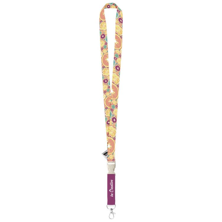Individuelles Lanyard aus RPET, mit abnehmbaren Metallkarabiner und Verschluss aus Weizenstrohkunststoff. Der Preis ist inkl. Sublimationsdruck auf beiden Seiten. Mindestmenge: 100 Stk