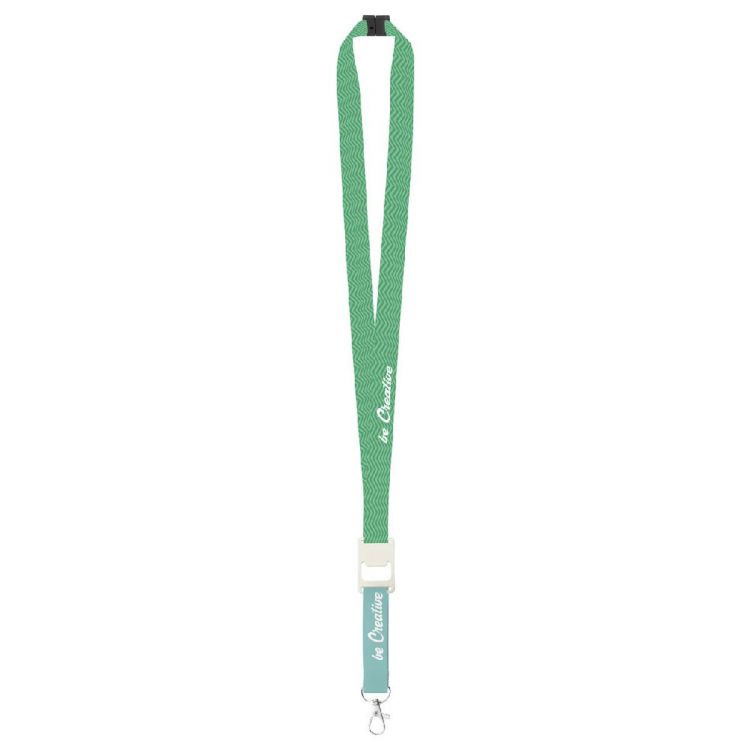 Individuelles Polyester-Lanyard mit Metallkarabiner, Flaschenöffner und Panikverschluss. Der Preis ist inkl. Sublimationsdruck auf beiden Seiten. Mindestmenge: 100 Stk