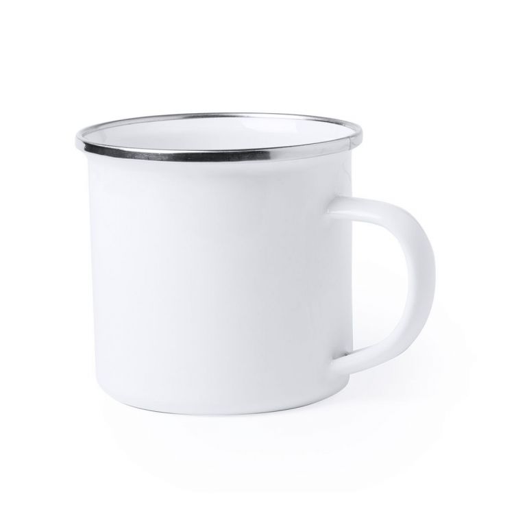 Metalltasse im Retro-Design, 380 ml Fassungsvermögen mit leichten Unvollkommenheiten, die das Retro-Design unterstützen. Speziell hergestellt für den Sublimationsdruck, mit elegantem, abgesetztem Rand und verpackt in einer individuellen Box. (weiß farbe)