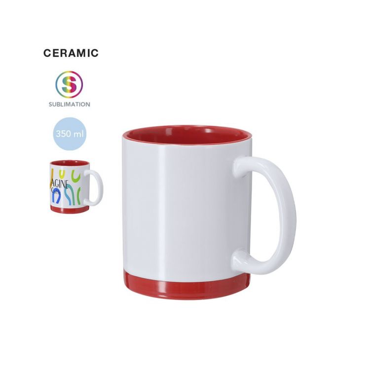 Keramiktasse mit einer Kapazität von 350 ml, entworfen mit weißem Außenbereich und farblichen Details in der Basis und im Innenbereich. Besonders für Sublimationsmarkierungen entworfen.