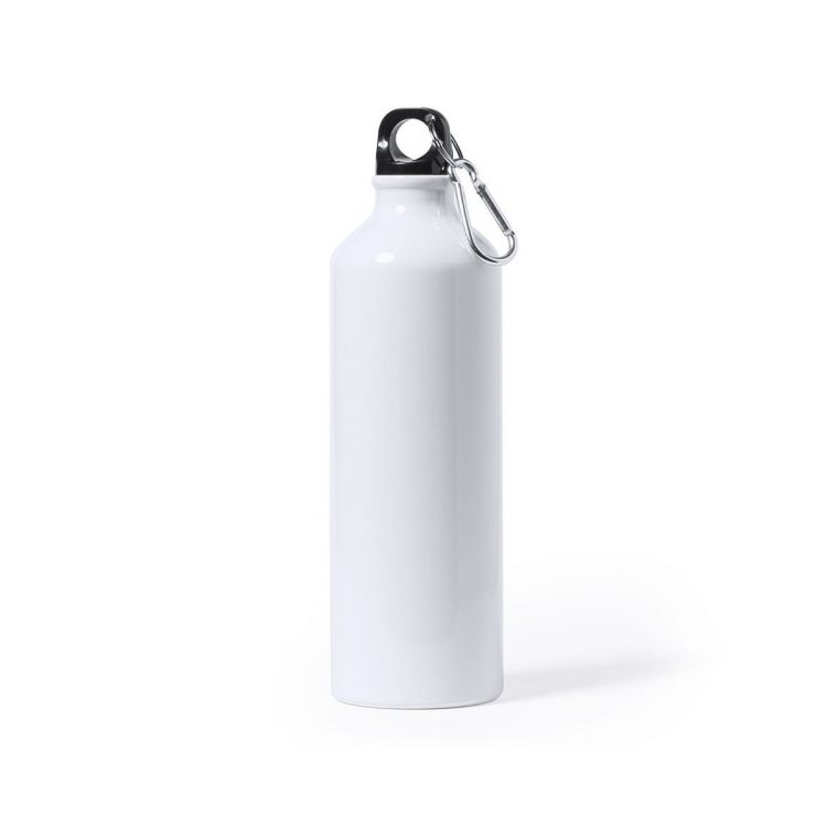 Aluminiumflasche mit einem Fassungsvermögen von 800 ml. In weichem und glänzendem Weiß, speziell für den Sublimationsdruck entwickelt. Mit aufschraubbarem Sicherheitsdeckel und Metallkarabiner für den Transport. Präsentiert in einer attraktiven Designbox. (weiß farbe)