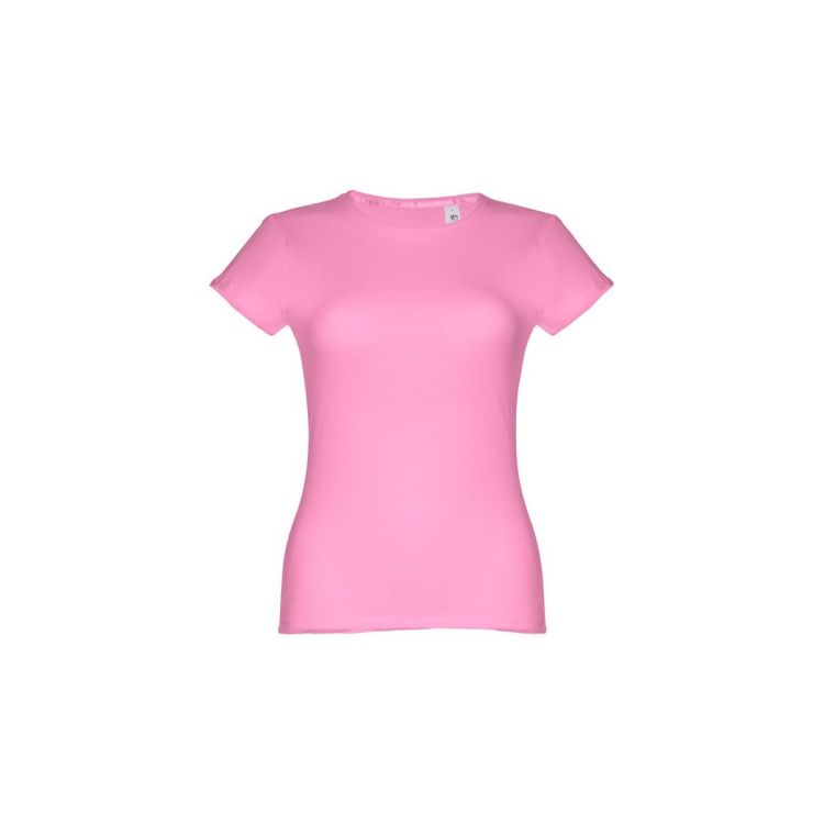 Damen T-Shirt aus 100% Strickjersey und Baumwolle (150g/m²) mit kardiertem Baumwollfaden, tailliert. Dieses hat einen dünnen Jersey-Kragen mit Satin-Verstärkungsband und eine Doppelnaht an Ärmeln und Saum. Bei der Farbe 183 bestehend aus 90% Baumwolle und 10% Viskose und Farbe 196 bestehend aus 98% Baumwolle und 2% Viskose, in hellrosa farbe, Größe S