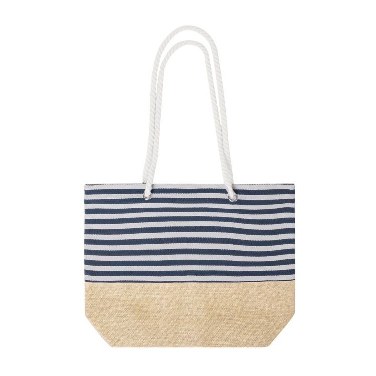 Tasche aus widerstandsfähiger 450g/m2 Baumwolle, mit Juteboden. Abgenäht und mit Reißverschluss, mit blau-weißem Streifenmuster. Lange Griffe aus weißer Baumwolle in Seilform, mit Ösen verstärkt. Widerstandsfähig bis zu einem Gewicht von 13 kg. (marineblau farbe)