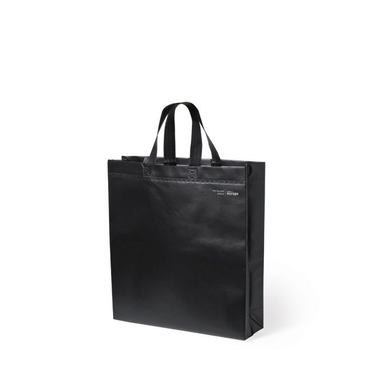 Linie "Natur" Tasche, hergestellt aus 120g/m2 recyceltem Vliesstoff mit Laminierung. Hergestellt in Europa, mit verschweißter Oberfläche, Seitenfalte, langen Griffen und Öko/Made-Emblem auf der Tasche.