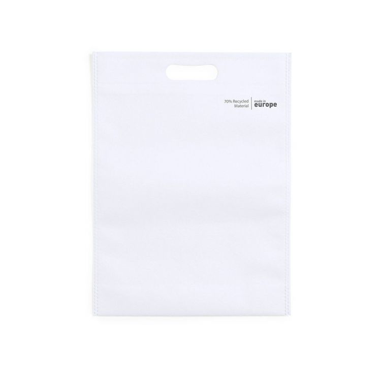 Linie "Natur" Tasche, hergestellt aus 70g/m2 recyceltem Vliesstoff. Hergestellt in Europa, mit verschweißter Oberfläche, Bodenfalte, verstärktem, gestanztem Griff und Öko/Made-in-Emblem auf der Tasche.