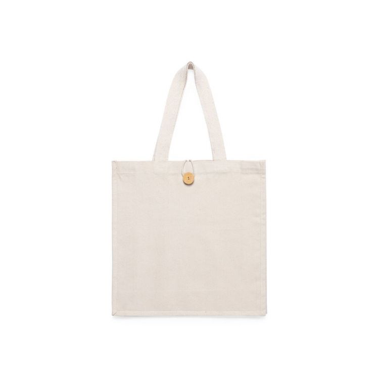 Tasche aus Baumwolle, natürliches Finish und Extragewicht von 310g/m2. Mit Original-Knopfverschluss, genähter Verarbeitung und Zwickel. Extra breite und verstärkte mittlere Griffe (60 x 3,5 cm). Widerstandsfähig bis zu 10 kg Gewicht. (natürlich farbe)