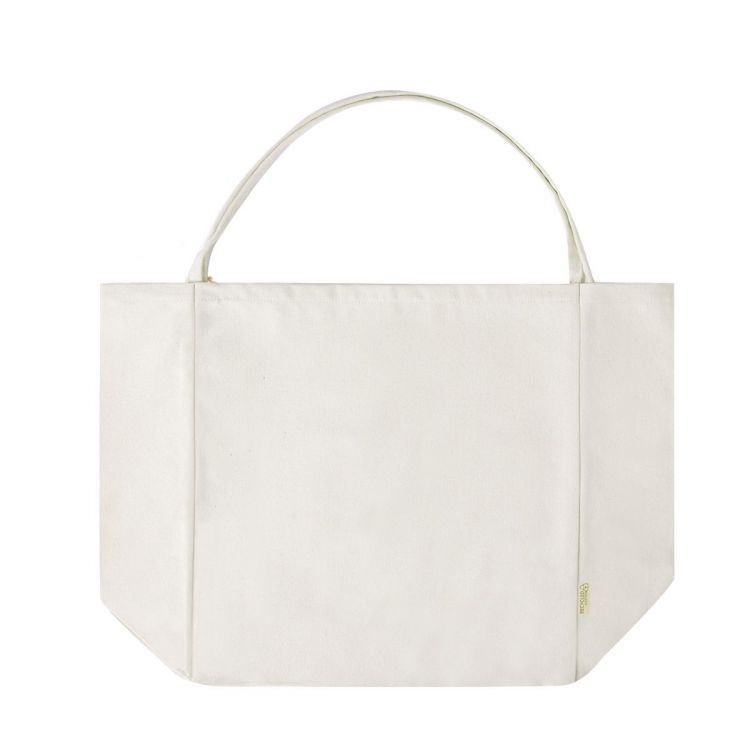 Tasche aus recyceltem Baumwollmaterial 300 g/m2. 60 cm lange Griffe mit Verstärkung, genähtes Ende und Zwickel. Etikett aus recycelter Baumwolle und Widerstandsfähigkeit bis zu 12 kg Gewicht. Erhältlich in natürlicher Farbe. (natürlich farbe)
