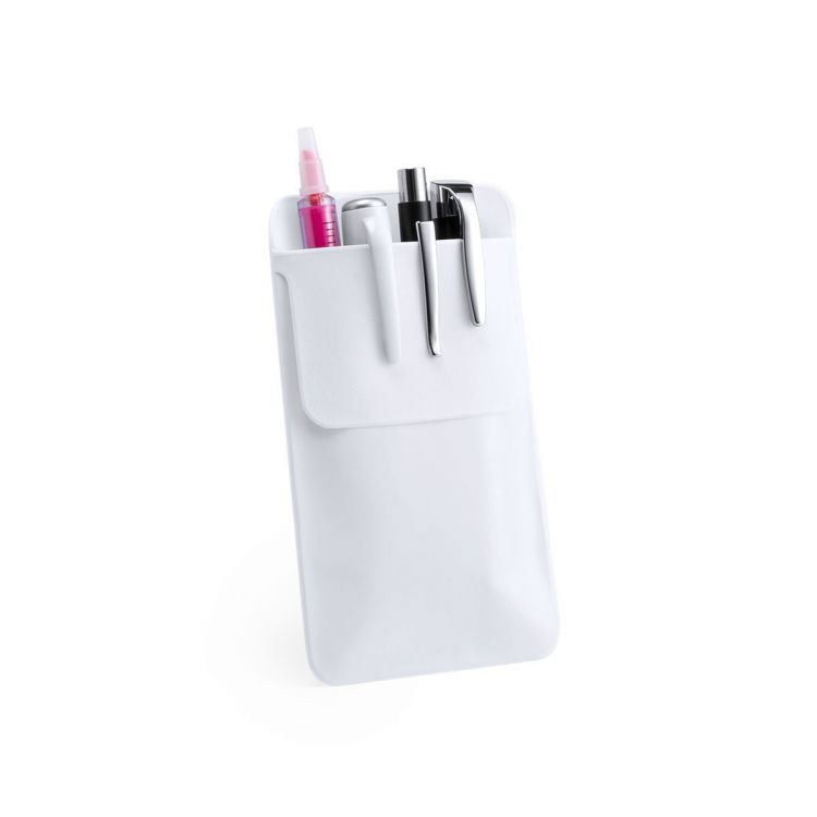 Taschenschutz für Stifte und andere Utensilien. Hergestellt aus robustem, hitzeversiegeltem PVC. Mit Umschlagklappe für einfaches Bedrucken. (weiß farbe)