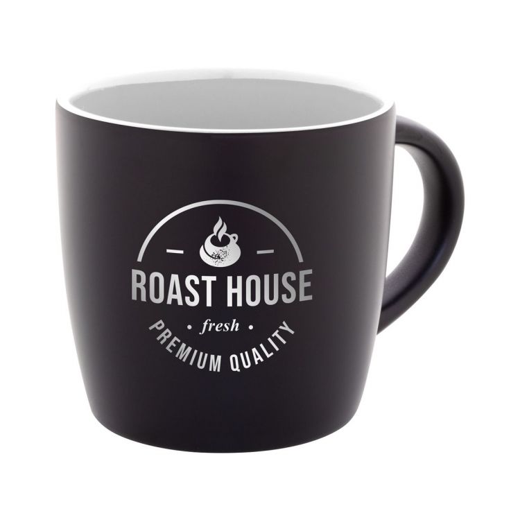 Schwarze Tasse aus Keramik mit farbiger Innenseite und Spezialbeschichtung für Gravuren. Das gravierte Logo ist farblich mit der Innenseite abgestimmt. Füllmenge: 300 ml. Einzeln in Kraftpapierbox.