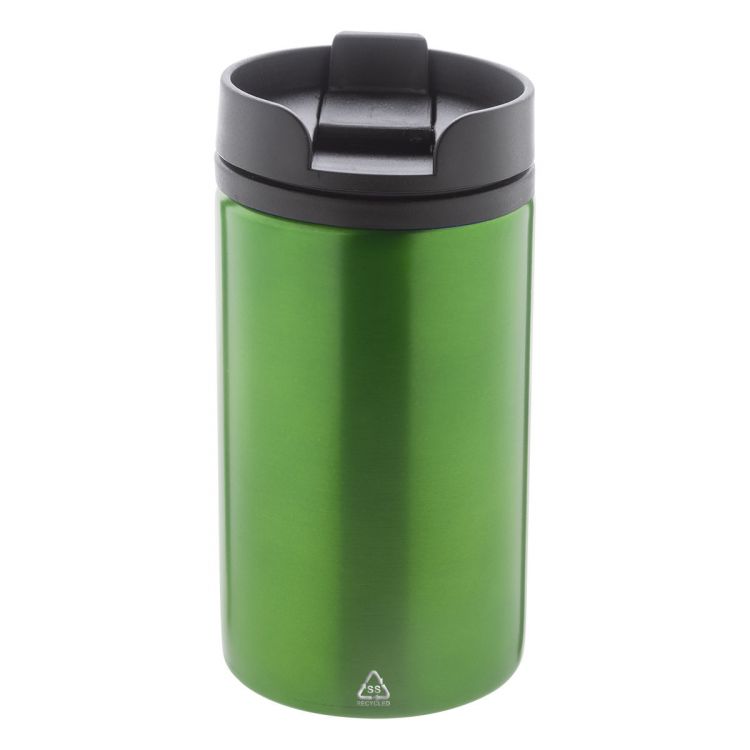 Doppelwandiger, isolierter Thermobecher aus recyceltem Edelstahl mit Innenseite aus PP-Kunststoff und Trinkdeckel. Füllmenge: 250 ml.