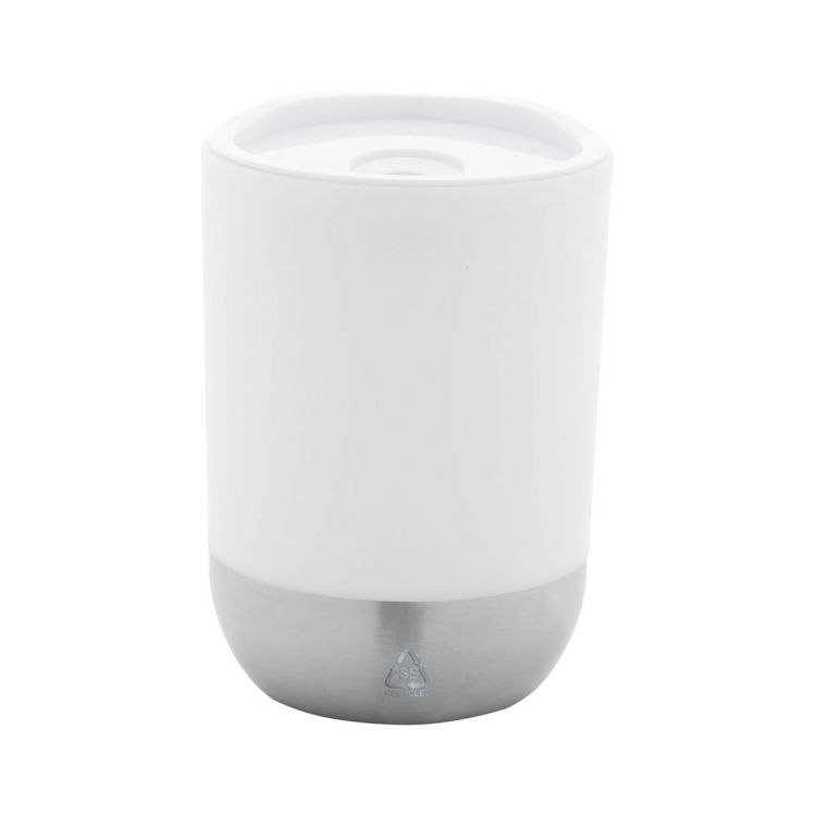 Thermobecher aus doppelwandigem PP-Kunststoff mit recyceltem Edelstahlboden und Trinkdeckel. Füllmenge: 300 ml.