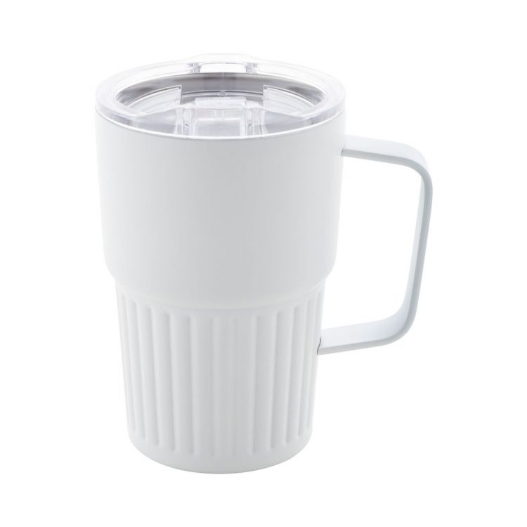 Doppelwandiger, isolierter Thermobecher aus recyceltem Edelstahl mit Trinkdeckel aus ABS-Kunststoff. Füllmenge: 470 ml.