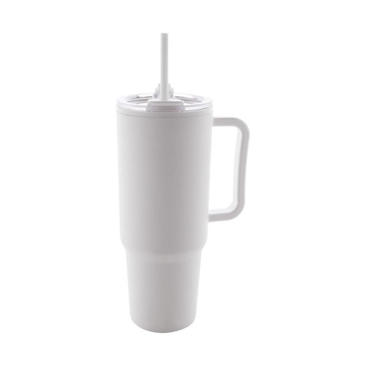 Doppelwandiger, isolierter Thermobecher aus PP-Kunststoff mit Trinkdeckel und Strohhalm. Füllmenge: 1100 ml.