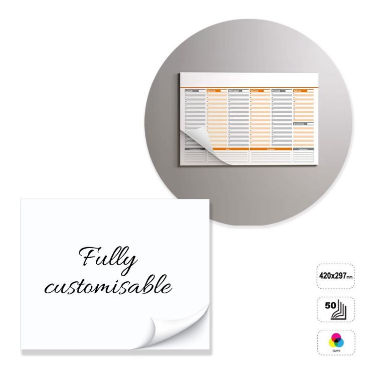 Horizontaler Tischplaner, vollständig anpassbar. Das Produkt besteht aus 50 Blättern 90-Gramm-Userman-Papier, die an der Oberseite verklebt sind. Das Produkt kann auf der Vorderseite oder auf Vorder- und Rückseite im Vierfarbendruck bedruckt werden. Nicht bedruckbare Rückseite aus weißem 300 g-Karton. Der Planer kann durch Abänderung der voreingestellten Vorlage individuell gestaltet werden oder komplett nach den Vorgaben einer neutralen Vorlage erstellt werden.