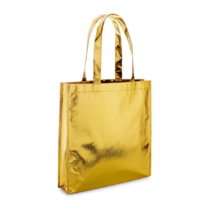 Tragetasche aus glänzend laminiertem Non-Woven (90 g/m²) mit 50 cm langen Henkeln, in gold farbe