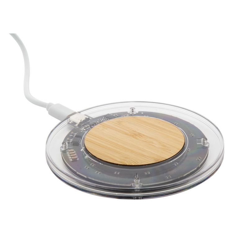 Wireless-Fastcharger (15 W) aus transparenten Kunststoff- und im Bambusgehäuse mit sichtbaren elektronischen Bauteilen. Inklusive USB-Ladekabel