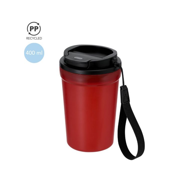 Tasse mit 400 ml Kapazität, hergestellt aus widerstandsfähigem recyceltem PP. Körper mit frosted transluzentem Finish. Dichtender schwarzer Deckel mit leicht zu öffnendem Dosierer, BPA-frei, mit Schraubverschluss und praktischer Traggriff aus Polyester. Mit Food-Grade-Zertifizierung zur Gewährleistung der Sicherheit beim Kontakt von Lebensmitteln mit dem für die Herstellung des Produkts verwendeten Material. Recyceltes PP ist ein recycelter und hochgradig recycelbarer Kunststoff von großer Festigkeit, der für zahlreiche Anwendungen geeignet ist.