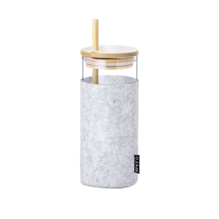Hochwertiger Trinkbecher mit 450 ml Fassungsvermögen. Der Körper besteht aus BPA-freiem Borosilikatglas, das eine außergewöhnliche Festigkeit und Haltbarkeit bietet, seine Lebensdauer verlängert und unzählige Male wiederverwendet werden kann. Inklusive weicher, nachhaltiger RPET-Filzhülle, Bambus-Schnappdeckel mit Strohhalmloch und wiederverwendbarem Bambus-Strohhalm. Mit unverwechselbarem RPET-Etikett. Präsentiert in individueller Ökodesign-Box.Recycelter RPET-Filz ist das Ergebnis der Kombination des Recyclingprozesses von Kunststoffen mit der alten Technik der Filzherstellung. Das Ergebnis ist ein Öko-Trendmaterial, das nicht nur recycelt, sondern auch wiederverwertet werden kann. (grau farbe)