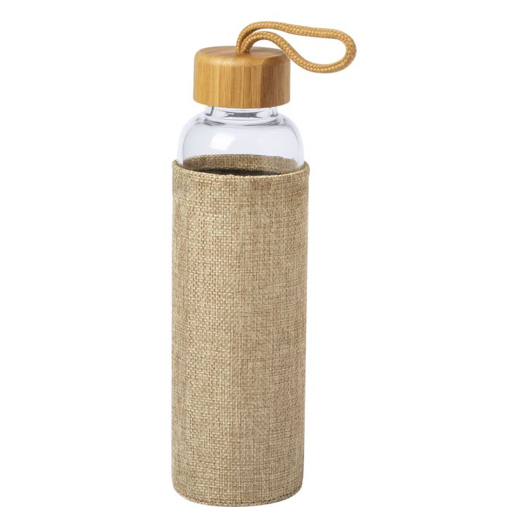Trinkflasche aus Glas mit naturfarbener Polyesterhülle, Bambusdeckel und Trageschlaufe. Füllmenge: 500 ml. Nicht geeignet für kohlensäurehaltige Getränke