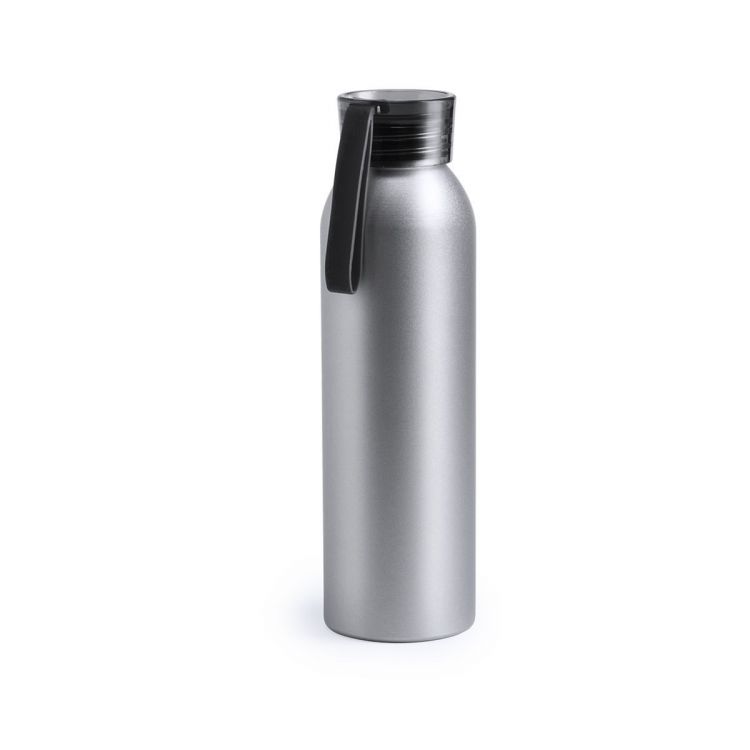 Trinkflasche aus Aluminium mit einem Fassungsvermögen von 650 ml. Silberfarbener Korpus, mit aufschraubbarem Sicherheitsdeckel in verschiedenen transparenten Farben. Passender Trageriemen aus TPR-Material.