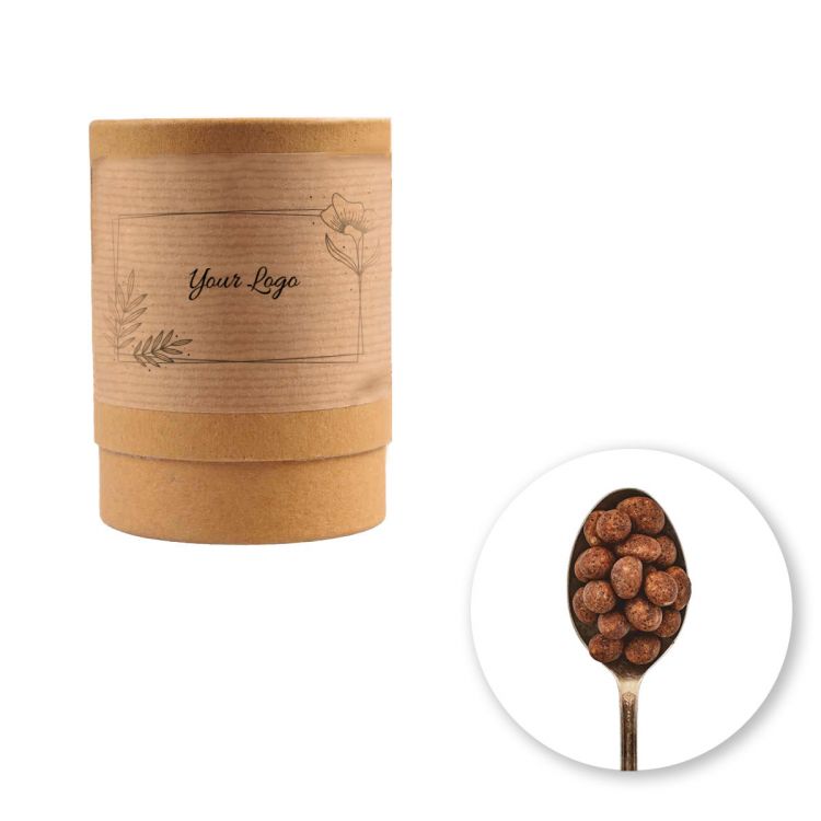 Packung mit Trockenfrüchten. Die Farben entsprechen der Art des Snacks: Dunkelbraun für Kaffeebohnen mit dunkler Schokolade überzogen (100 g), Schokolade für Stachelbeeren mit dunkler Schokolade überzogen und mit Kakao bestäubt (100 g), Kupfer für Sultaninen mit weißer Schokolade überzogen und mit Kakao bestäubt (100 g), Kaffee (100g), Bronze mit Orangenschale überzogen mit dunkler Schokolade mit einem Hauch Earl Grey (100g), Gold mit karamellisierten Erdnüssen (100g). Verpackung: Kraftpapierschachtel mit transparentem Fenster auf der Vorderseite. Möglichkeit der Personalisierung des auf dem Deckel anzubringenden Klebeetiketts (Papieroberfläche: weiß oder Kraftpapier, bei der Bestellung auszuwählen). Mindesthaltbarkeit: 6 Monate.