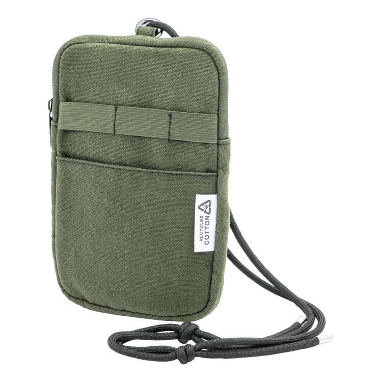 Umhängetasche für Mobiltelefone aus recyceltem Canvas mit Hauptfach mit Reißverschluss, Fronttasche und verstellbarem Schultergurt aus RPET-Polyester. Material: 70 % recycelter Baumwolle und 30 % RPET-Polyester. Mit Label recycelte Baumwolle.