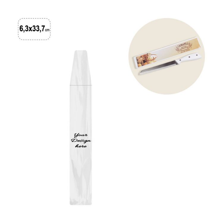 Langer Umschlag aus transparentem PVC mit Öffnung an der kurzen Seite zum Einstecken von Papiereinlagen, wiederverschließbar mit Klappe.
