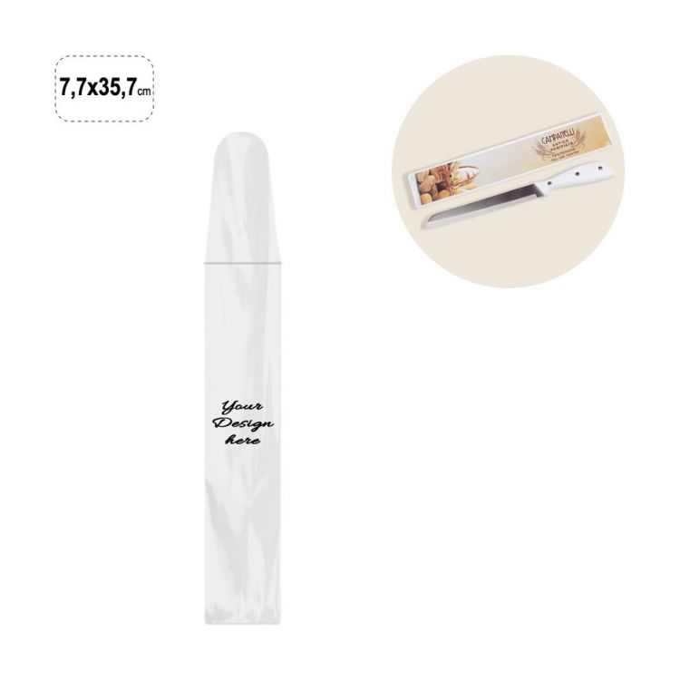 Langer Umschlag aus transparentem PVC mit Öffnung an der kurzen Seite zum Einstecken von Papiereinlagen, wiederverschließbar mit Klappe.