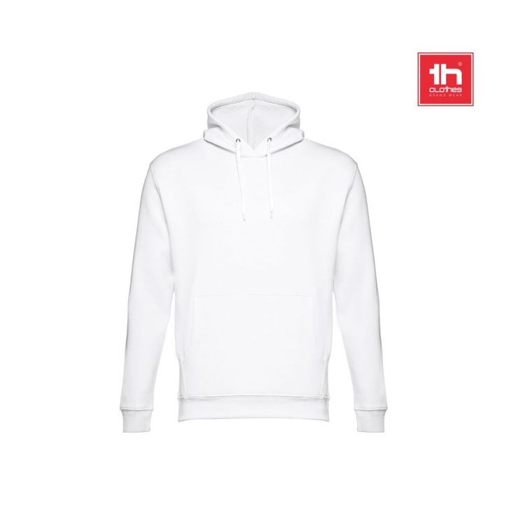 Sweatshirt aus 50% Baumwolle und 50% Polyester (320g/m²), unisex. Innen kardiert mit Ripp 1x1 an Ärmelbündchen und Bund, einer Kängurutasche und einer Kapuze mit Kordelzug