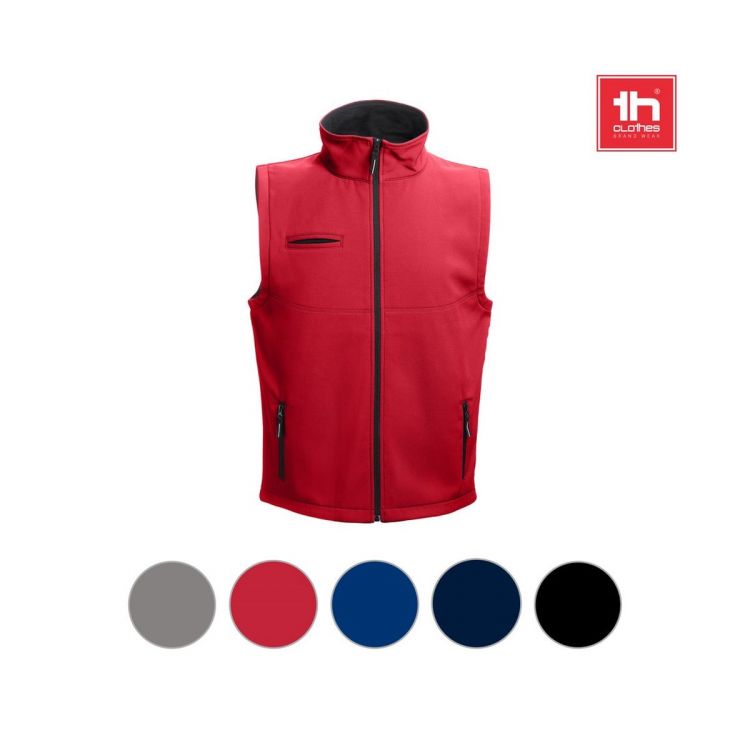Weste aus Softshell bestehend aus 96% Polyester und 4% Elasthan (2 Schichten): 280g/m². Diese hat eine wasserabweisende Beschichtung und die Rückseite ist länger als die Vorderseite. Diese Weste hat 3 Taschen: einfache Brust- und 2 Reißverschlusstaschen. Zugangsbereich vereinfacht die Veredelung