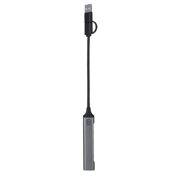 USB Hub aus recyceltem Aluminium. Mit dualem USB/Typ C-Anschluss und 4 Ports: 1 Typ C-Anschluss 2.0 und 3 USB-Ports. Mit Logo aus recyceltem Aluminium.Recyceltes Aluminium ist ein Material mit nahezu unendlichen Recyclingmöglichkeiten, ohne seine ursprünglichen Eigenschaften zu verlieren und dabei weniger Energie zu verbrauchen.GRS (Global Recycled Standard)-Zertifizierung, die den recycelten Ursprung des zur Herstellung des Produkts verwendeten Materials garantiert. (silber farbe)