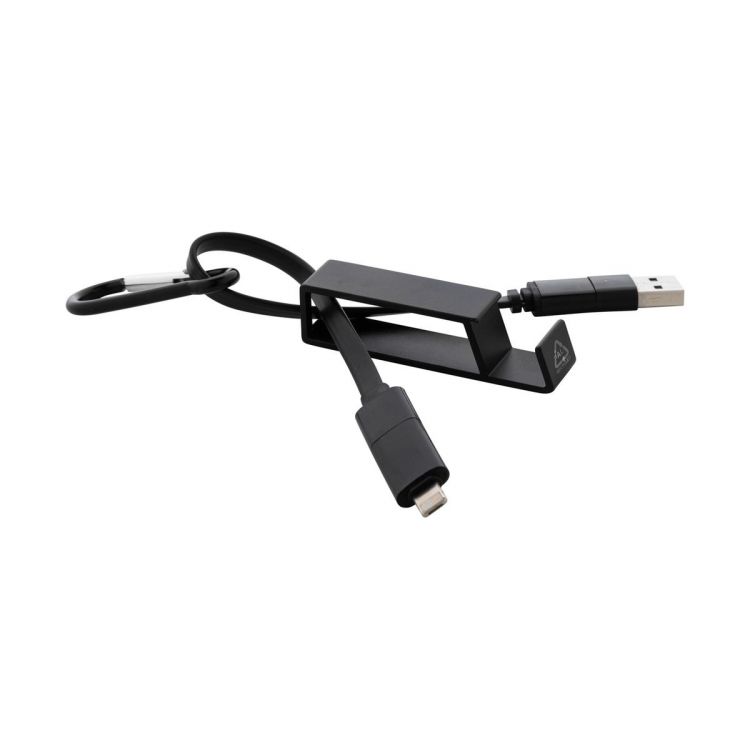 USB-Ladekabel mit Karabiner aus recyceltem Aluminium und Handyhalter mit Flaschenöffnerfunktion. Mit Micro-USB-, USB-C- und Lightning-Anschlüssen. Mit USB- und USB-C-Eingängen.