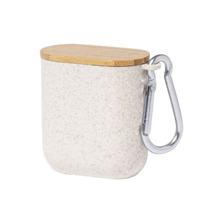 USB-Ladekabel im ökologischen Weizenstroh-Kunststoffgehäuse mit Karabiner und Bambus-Handyhalterdeckel. Mit Micro-USB-, USB-C- und Lightning-Anschlüssen. Mit USB- und USB-C-Eingängen, in natürlich farbe